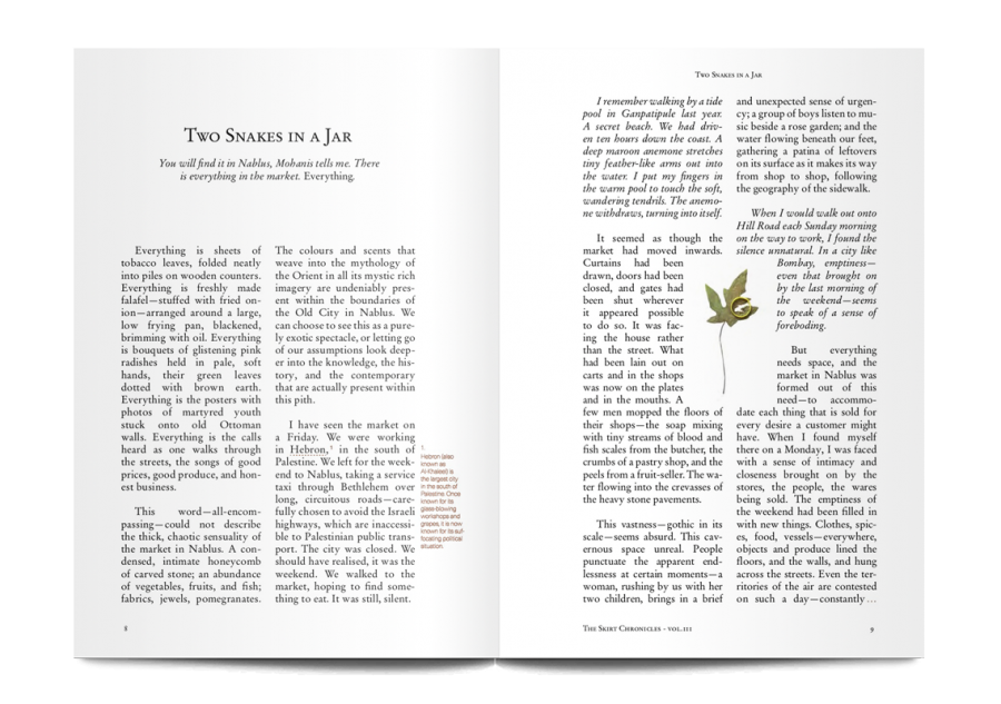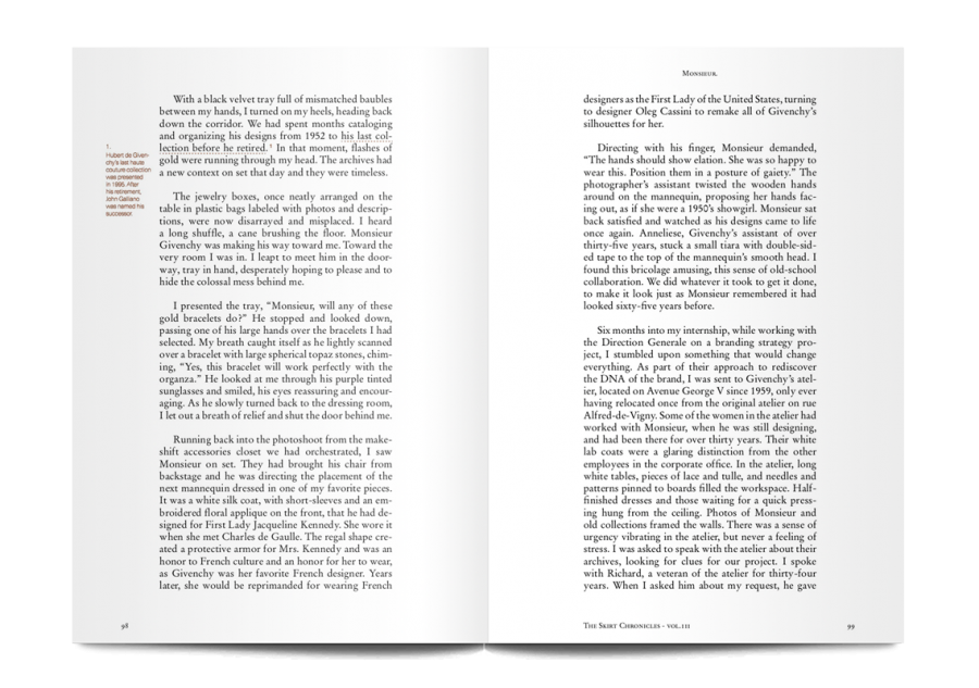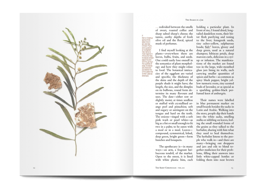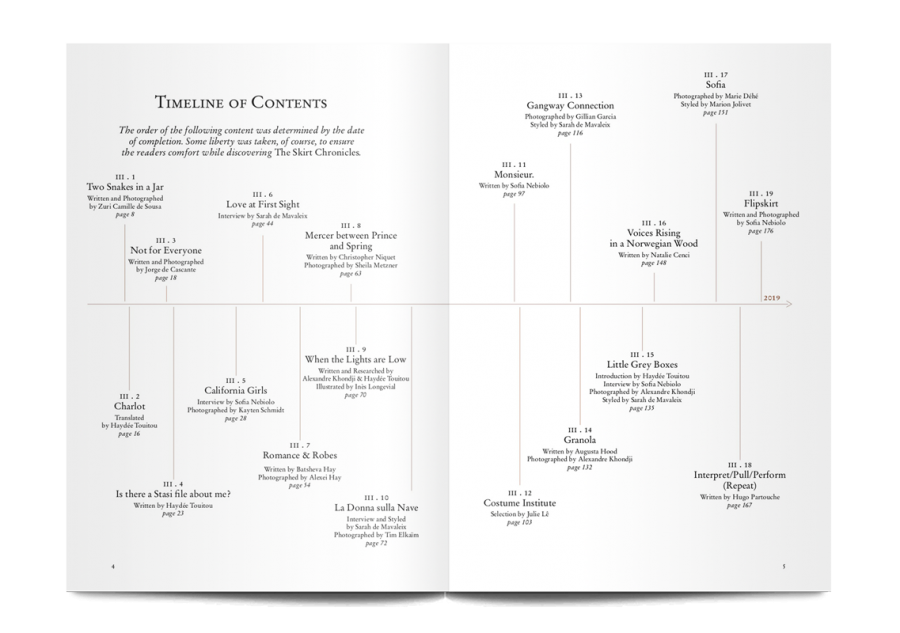 Organised chronologically, the content that appears in the magazine is determined by the date of completion. More of a principle than a rigid system — “Some liberty was taken … to ensure the reader’s comfort while discovering The Skirt Chronicles,” as its editors write — it is, most importantly, a title covering literature, fashion, politics and beyond, all from its own unique and recognisable perspective.