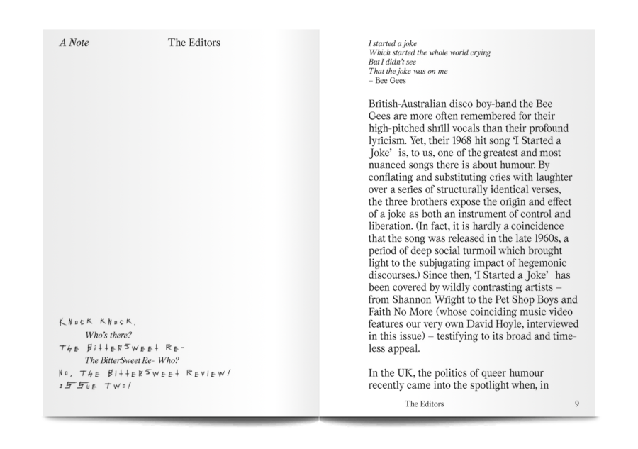 Describing itself as, “A literary magazine for queers and their friends”, The BitterSweet Review is a publishing platform dedicated to the advancement of queer literature and visual culture. This second issue is themed, ‘I started a joke’, exploring the places where queer culture and humour rub up against each other.