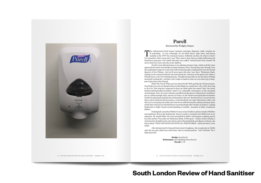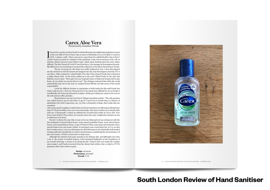 The South London Review of Hand Sanitiser is simultaneously a fond parody of the London Review of Books, a silly excuse for writing about hand sanitisers, and a heartfelt experiment in creativity and collaboration.