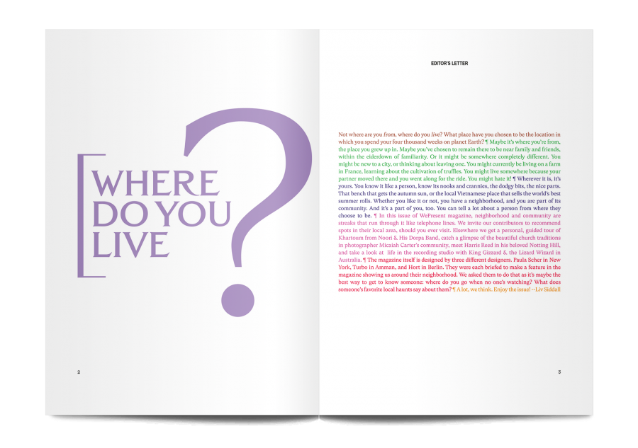 A crazy experiment in the power of graphic design, each issue of WePresent is created in three separate versions by three different sets of designers. The designers for this fifth issue are Paula Scher in New York, Turbo in Amman, and Hort in Berlin, and this product page is for the version designed by Paula Scher.
