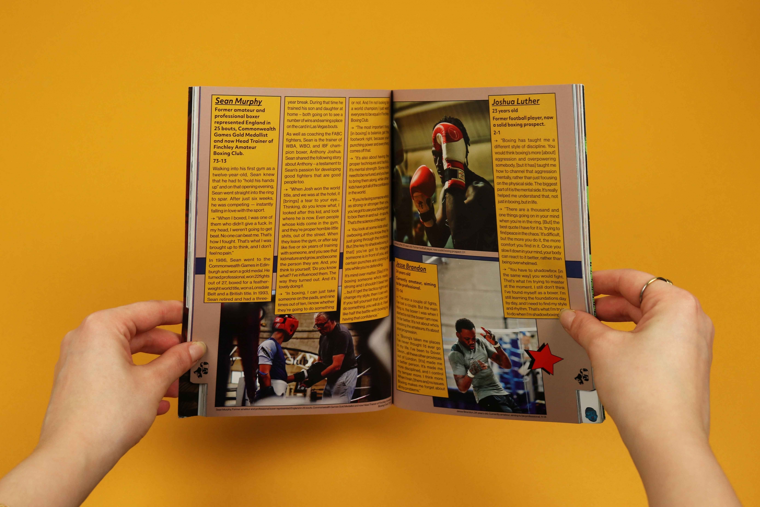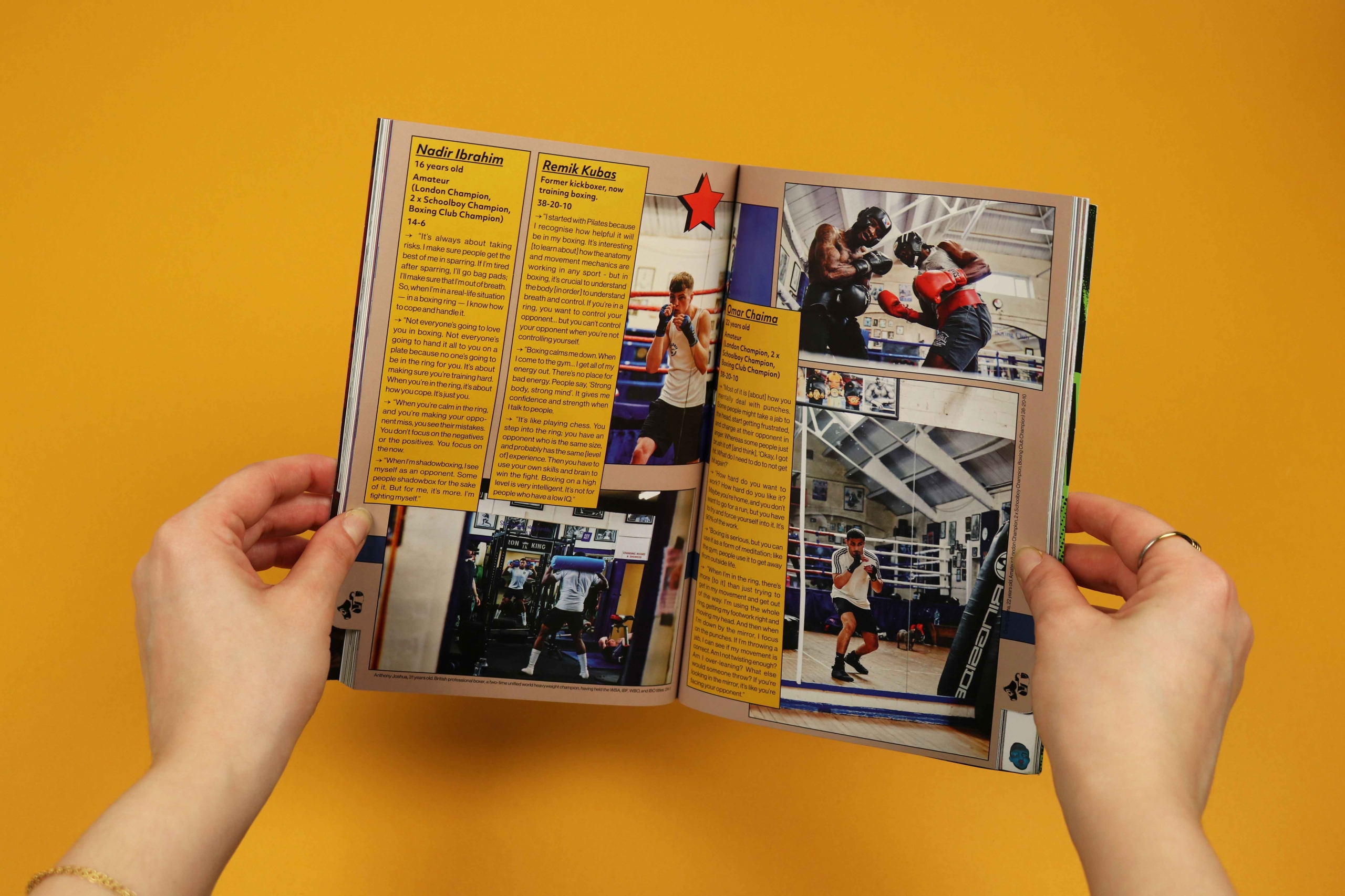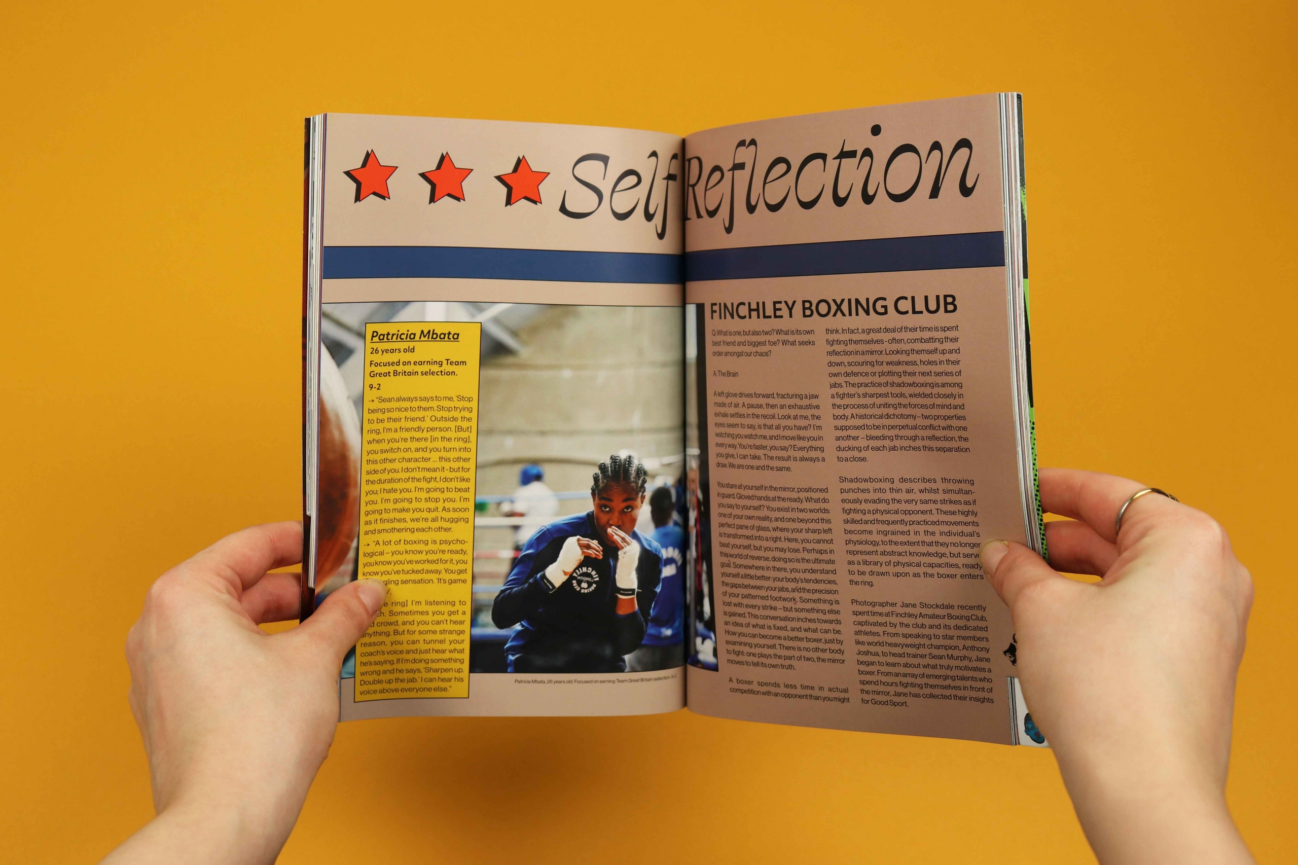 Often the relationship is more subtle – one of my favourite pieces is story M, which shows boxers training in the gym, some of them pictured shadow boxing, while in interviews they reflect on themselves and their sport. It’s not made explicit, but with all these reflections bouncing across the pages, it seems that in this case, ‘M’ is for mirror.