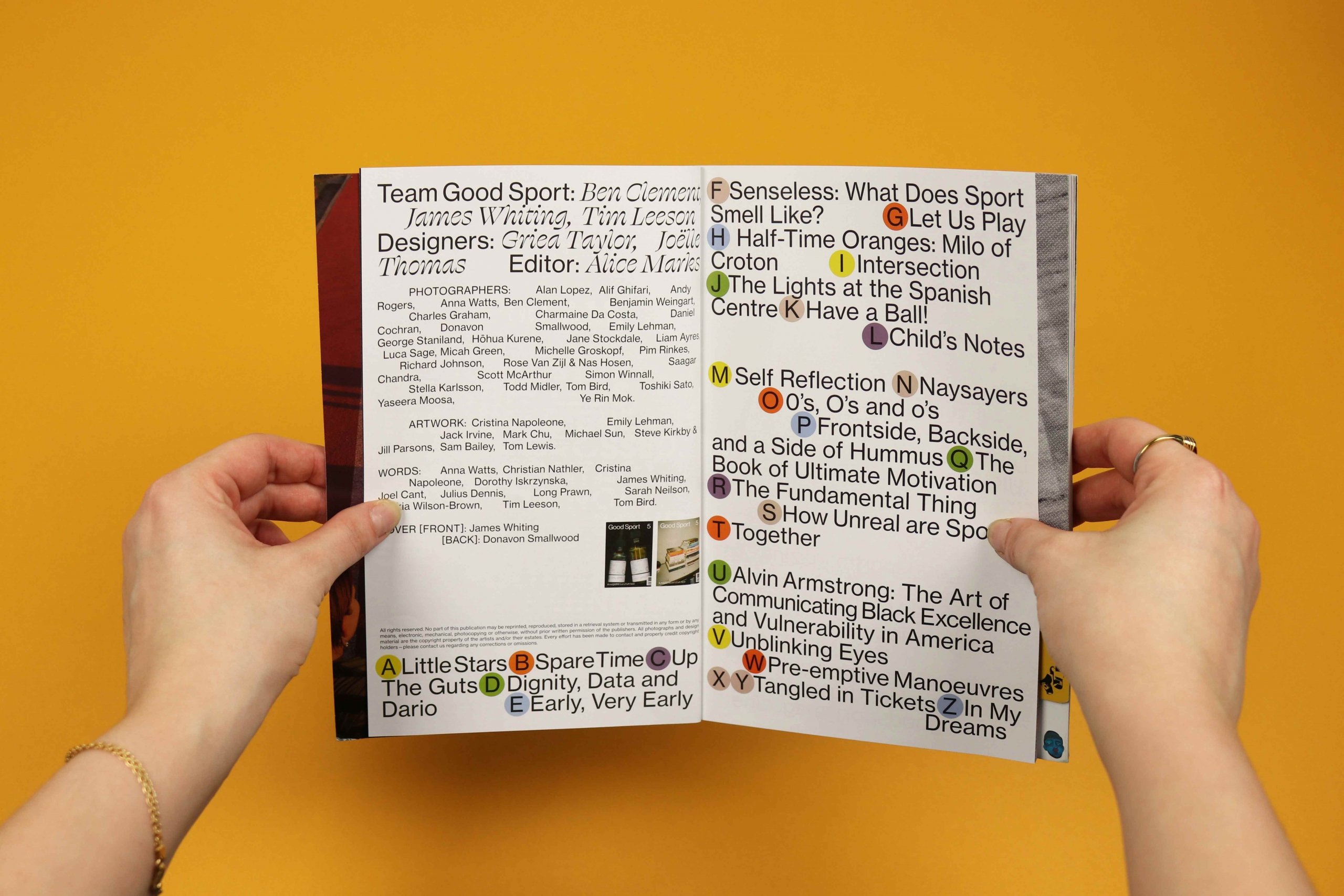 So far, so straightforward. But the tricky bit is in the structure – this issue of Good Sport has dispensed with page numbers and instead uses letters to locate its stories. The contents page looks like it’s been crossed with a subway map, and each of these letters doesn’t just dictate the position of the story in the magazine, but also influences the subject matter itself.
