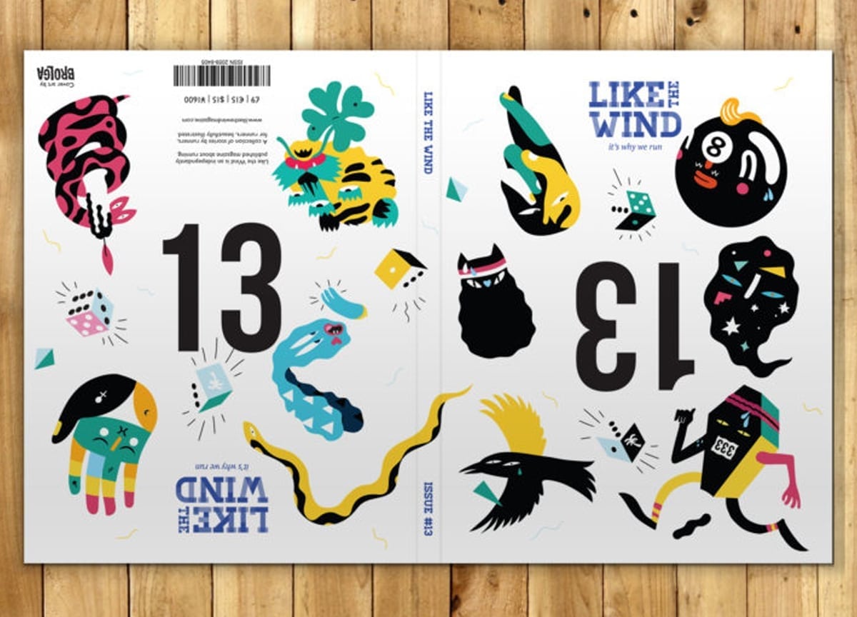 This is very superstitious… The number 13 is on the cover. Twice. Some runners (and cyclists) will actually wear their race bib upside down if they’re assigned 13 in order to negate the superstitious luck associated with that number. Because of course if it’s upside down it’s not 13! Inspired by this, our guest designer Alex Murphy came up with the idea of two magazines in one, printing half the book one way up and half “upside down”, with 13 printed upside down on both covers and surrounded by New York artist Brolga’s design work. Basically, there’s no right or wrong way to read the issue.