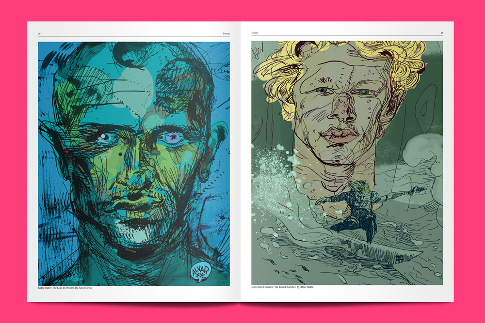 Firstly it’s a way to stand out, since most surf magazines are printed in a traditional glossy magazine format. The large tabloid also aligns with the mission of the publication: to democratise surfing. A good newspaper offers language that should illuminate virtually any subject for any reader. It also serves as the perfect canvas for our artists, who specialise in bold illustrations that bring to mind the comics of old-fashioned American broadsheets.