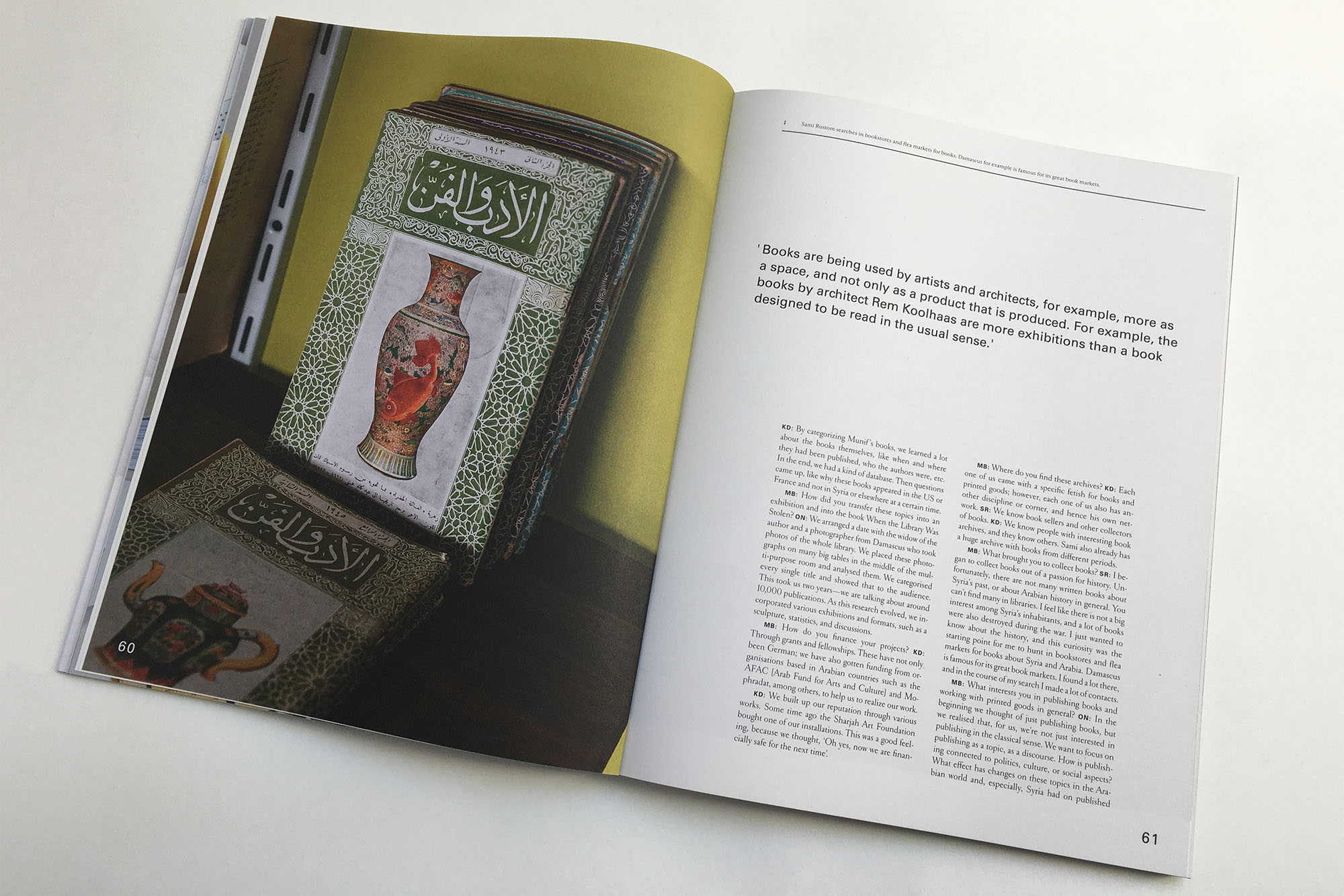 Sami Rustom is a book collector and one-third of Syrian collective Fehras Publishing Practices. Now based in Berlin, the three men use their art and publishing output to reflect on their country’s history and current cultural identity.