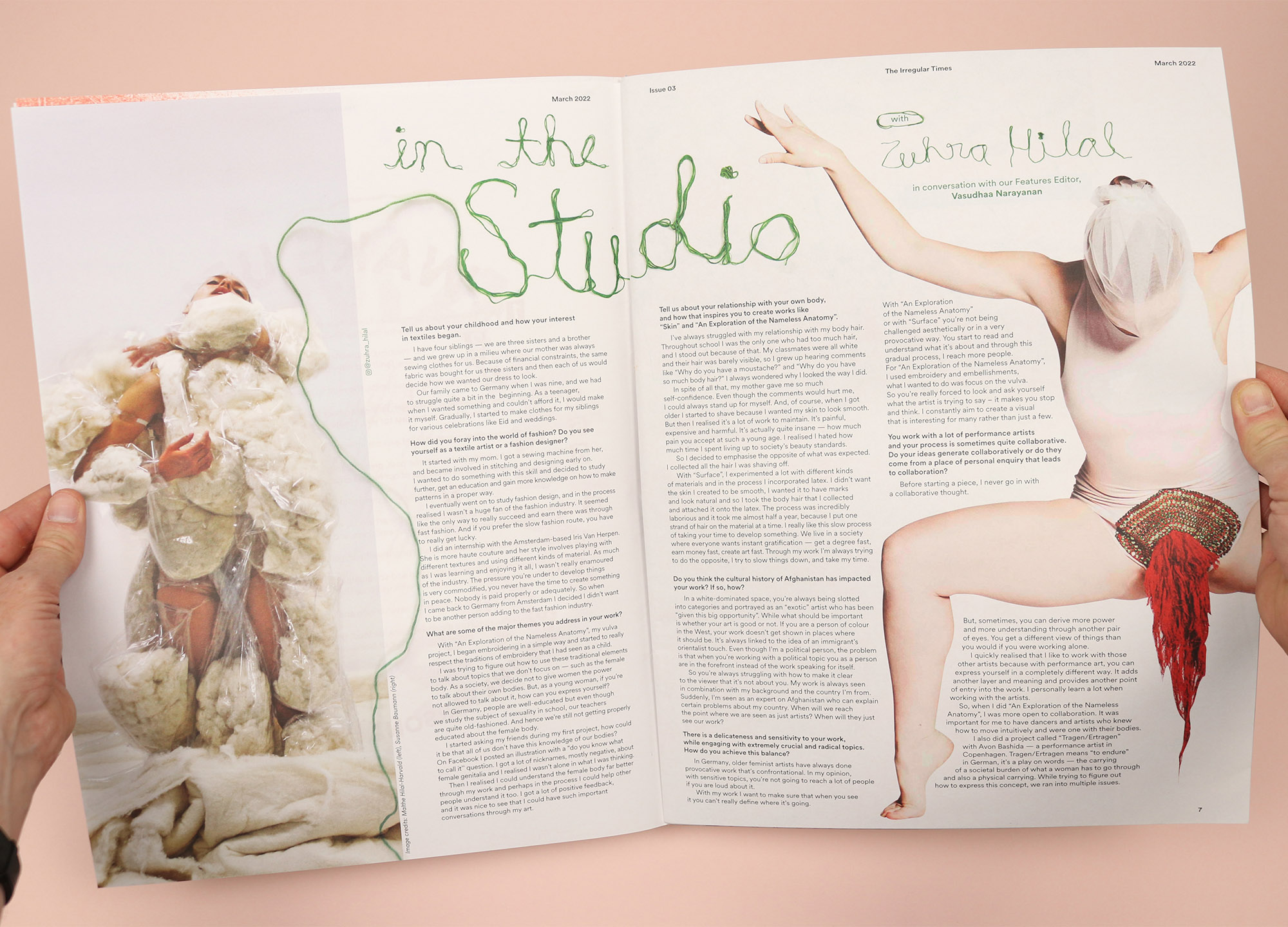 In reality I think the magazine pulls its punches a little more than that, and the manifesto’s headline statement of, “the personal is political” makes for a better encapsulation of its tone and concerns. The lead story with Afghan artist Zuhra Hilal, for example, focuses on her experiences as an immigrant, her relationship with her body hair, and how that has fed into her work. It’s an interesting interview, particularly when she’s asked how the cultural history of Afghanistan has impacted her work:
