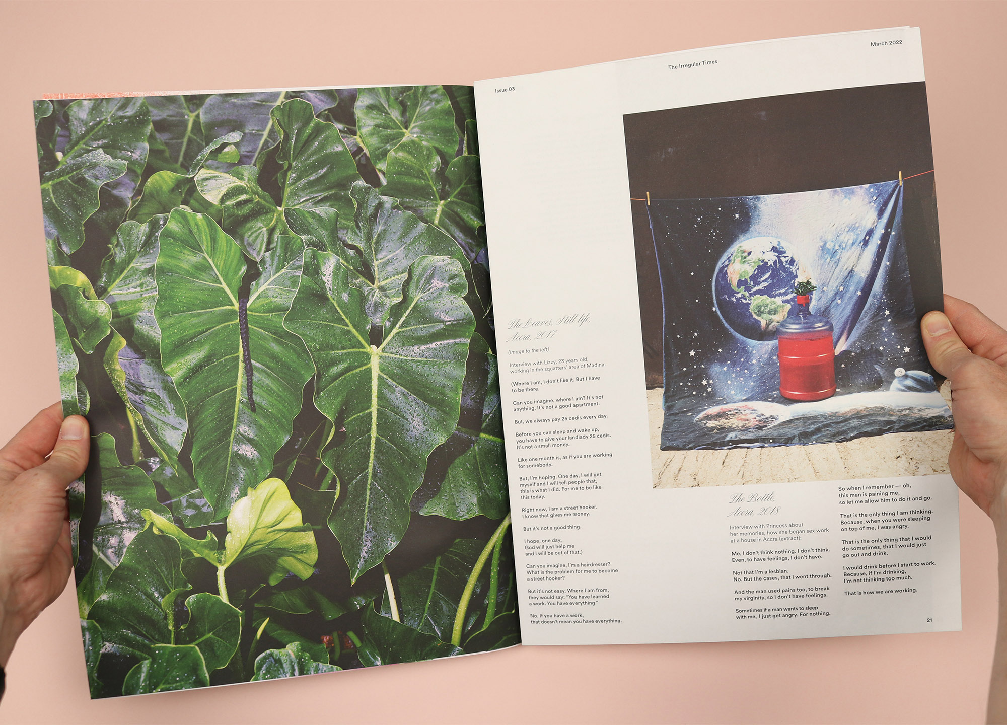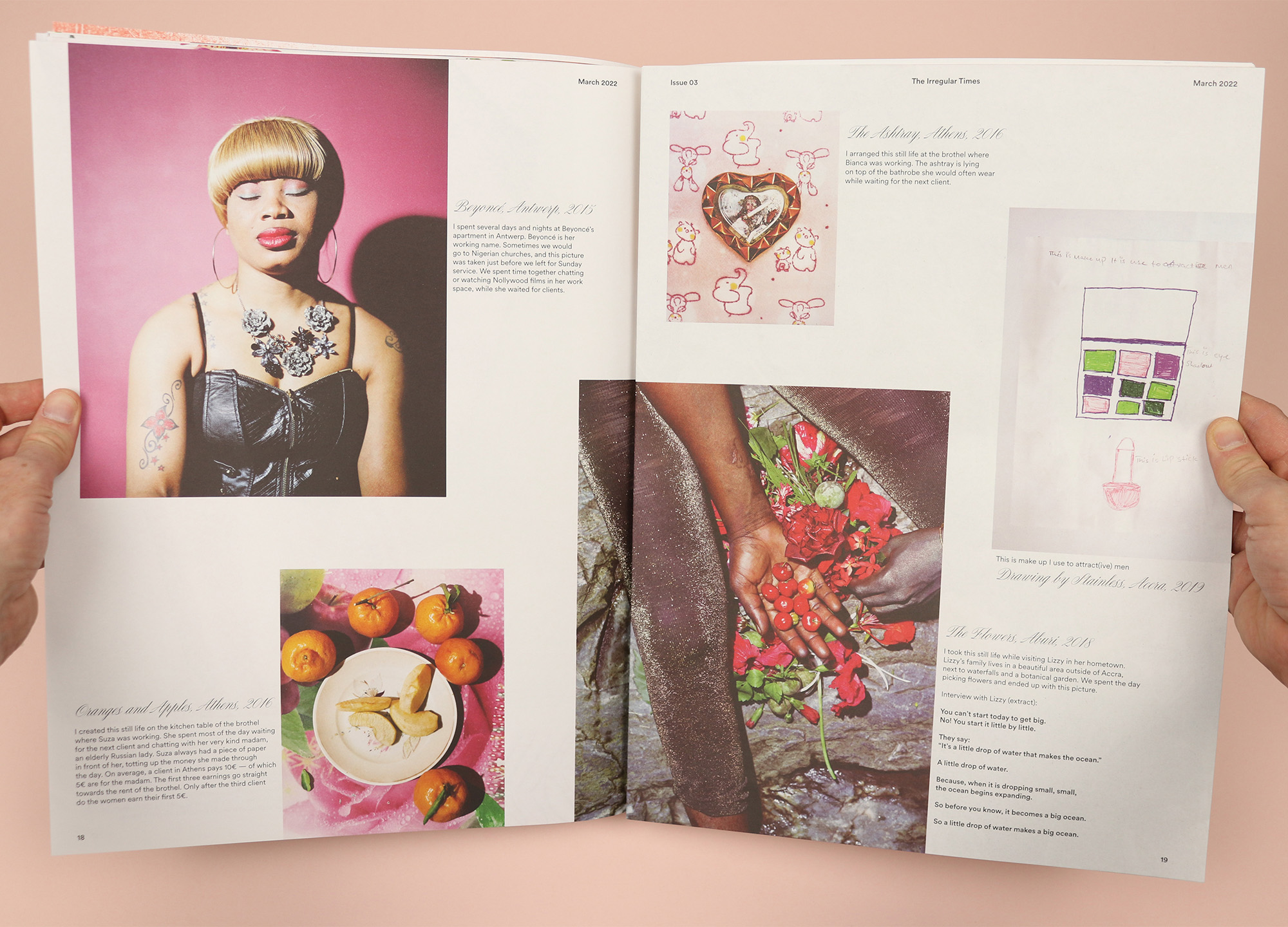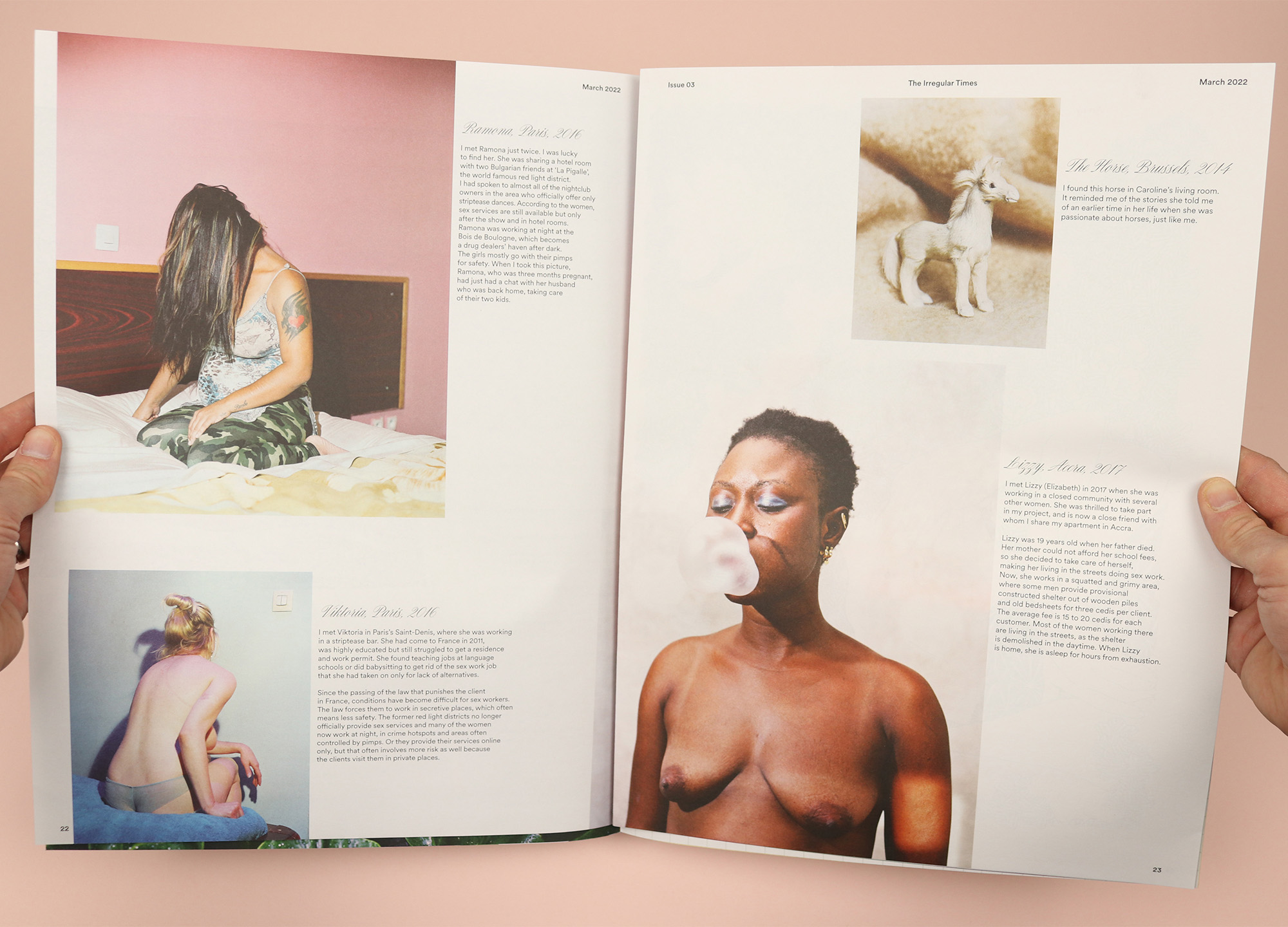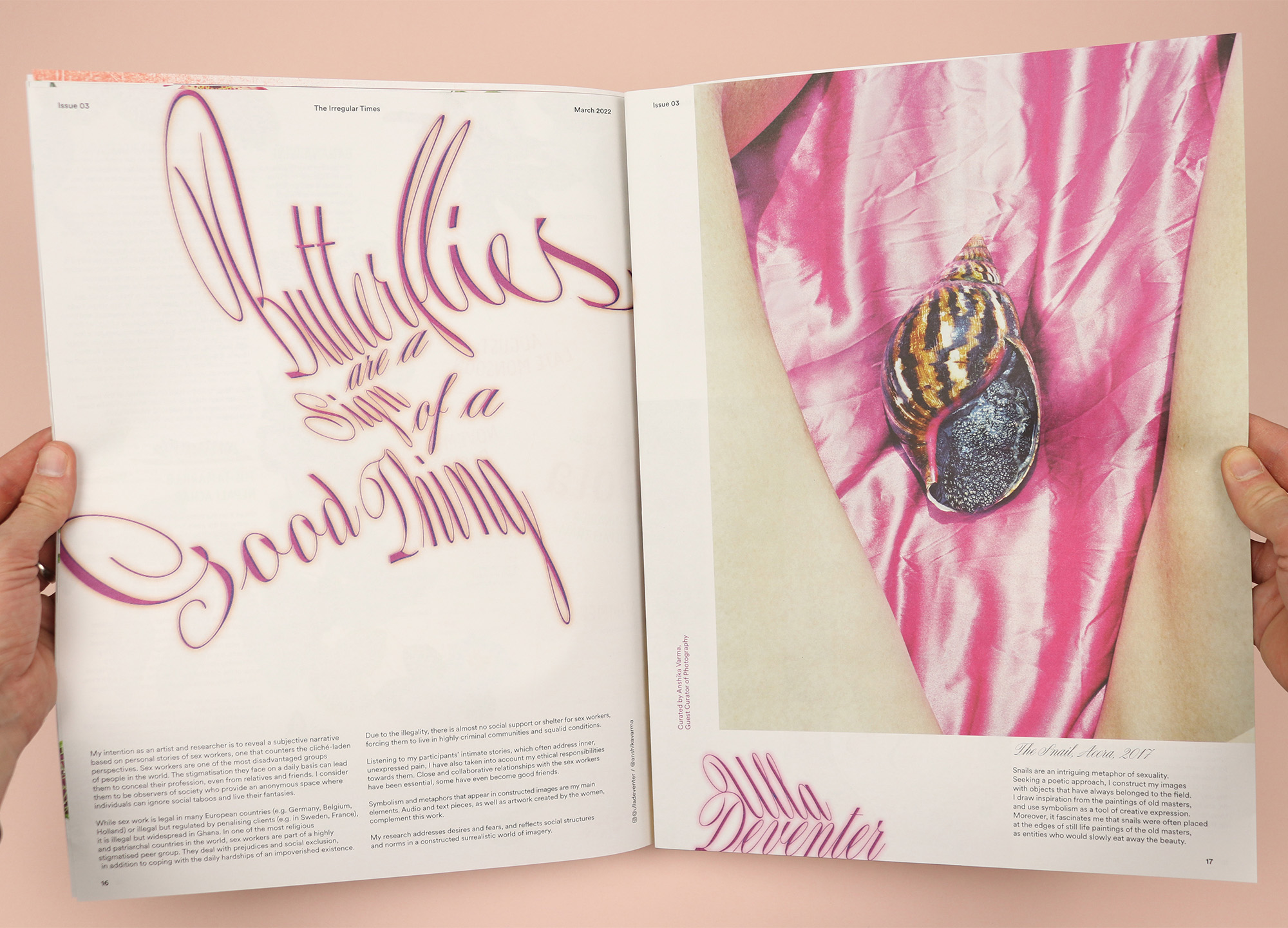 That sentiment is sometimes heard in western media, but I found it particularly powerful in this context, where the assumed identity of the reader is a non-white person. It was that shift of perspective, along with the magazine’s extremely international line up, that makes The Irregular Times feel so distinctive. For example Ulla Deventer’s Butterflies are a Sign of a Good Thing features photographs of sex workers in Accra, Antwerp, Athens, Brussels and Paris, and details the difficulties of their lives, as well as their passions and aspirations. A German artist, in an Indian magazine, showing work that features women from across Africa and Europe, it feels both geographically and culturally free.