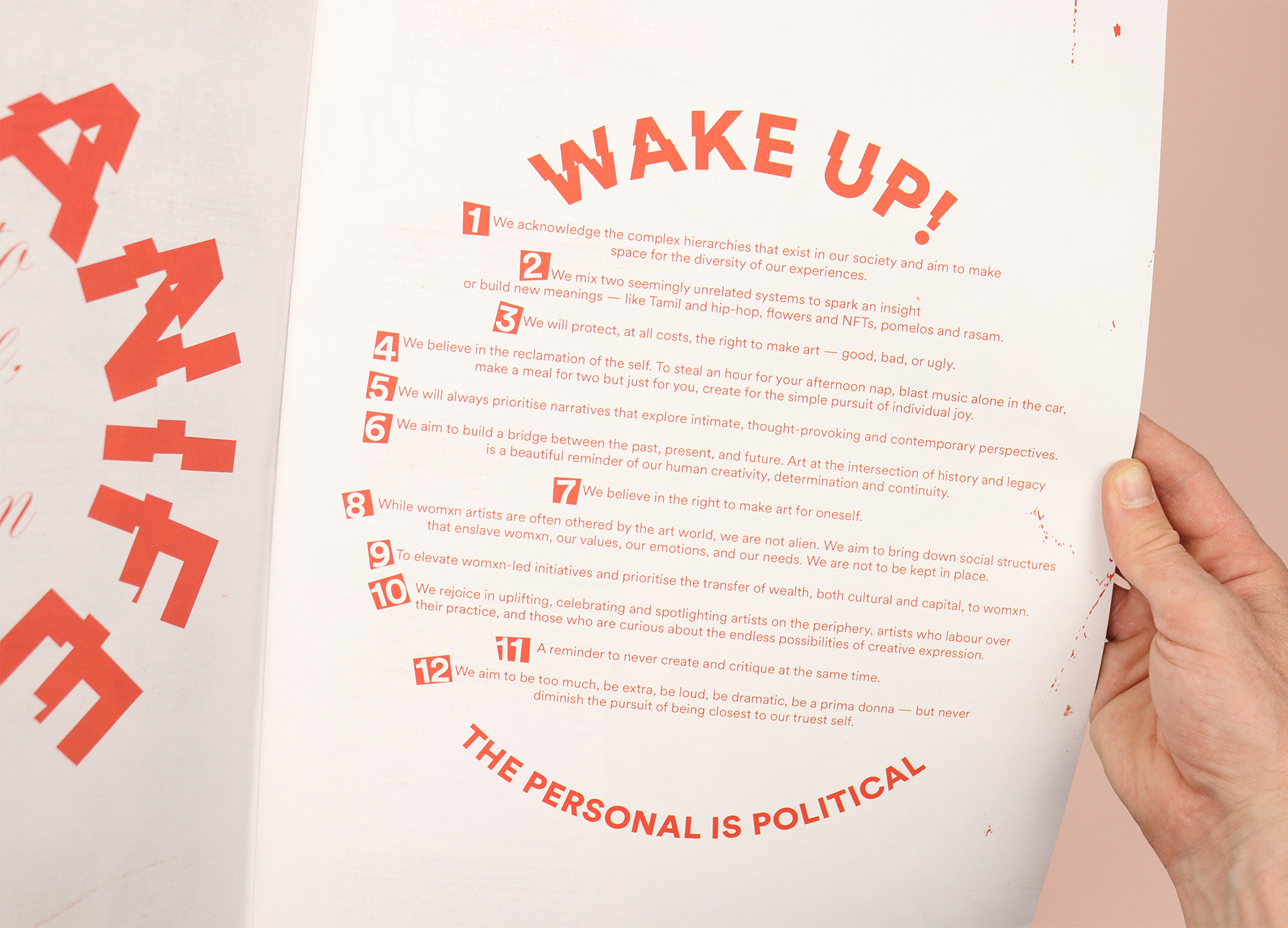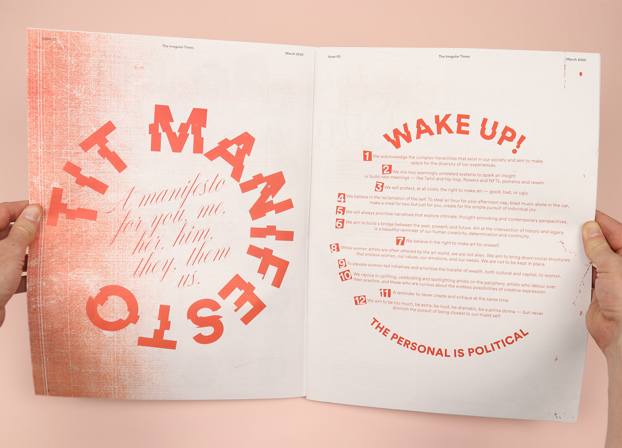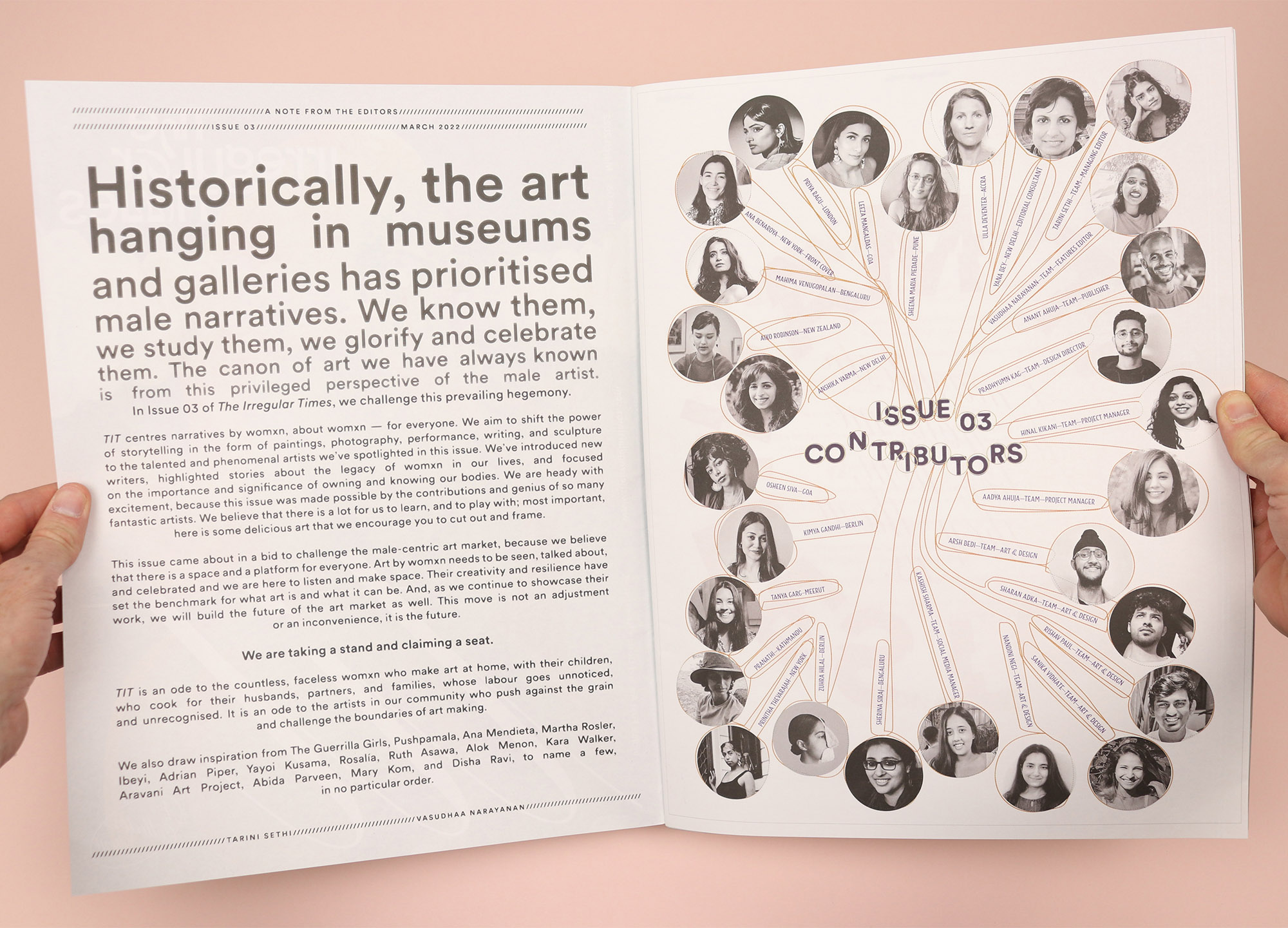 On the inside front cover the note from the editors explains that this issue, “centres narratives by womxn, about womxn – for everyone”, and makes it clear that it’s not just about the creative people whose voices are generally heard: “TIT is an ode to the countless, faceless womxn who make art at home, with their children, who cook for their husbands, partners, and families, whose labour goes unnoticed, and unrecognised. It is an ode to the artists in our community who push against the grain and challenge the boundaries of art making.”