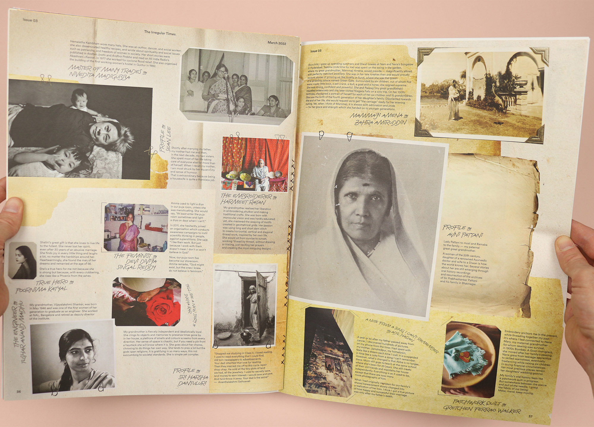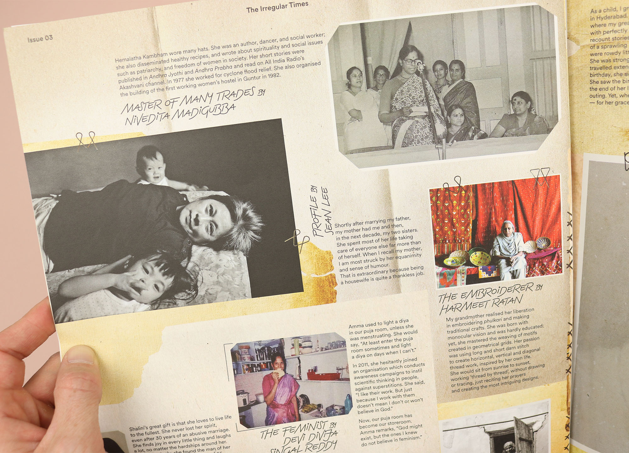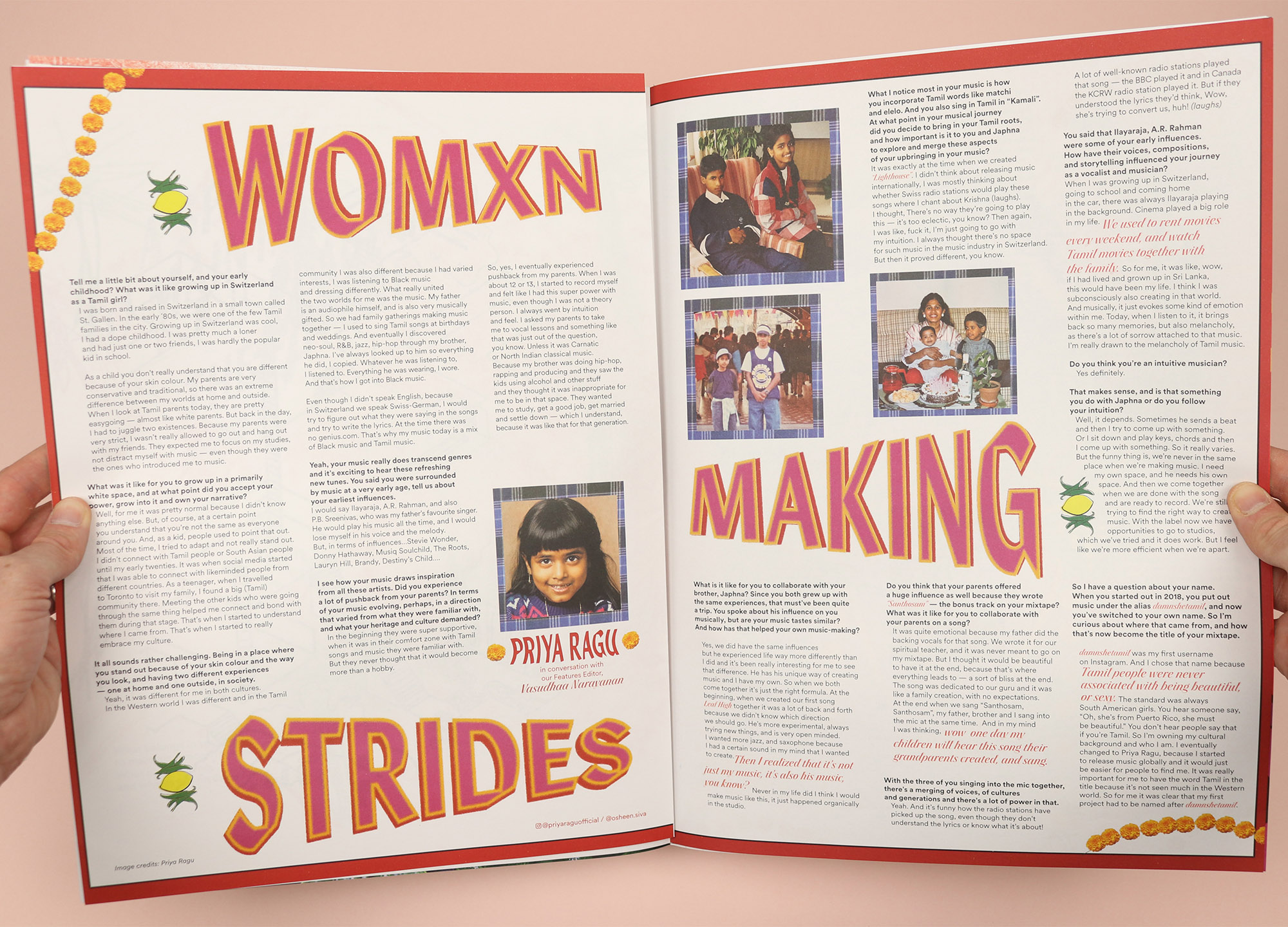 There is a strong Indian identity to the magazine, but it is constantly shifting and being renegotiated, rather than settling into didactic terms. So for example there’s an interview with Swiss-Tamil singer-songwriter Priya Ragu, which emphasises the many cultural influences on her work, while Anshika Varma turns to her family archives to present a history of the women who shaped her, focusing on their crafts, their travels, and the different ages they lived through.