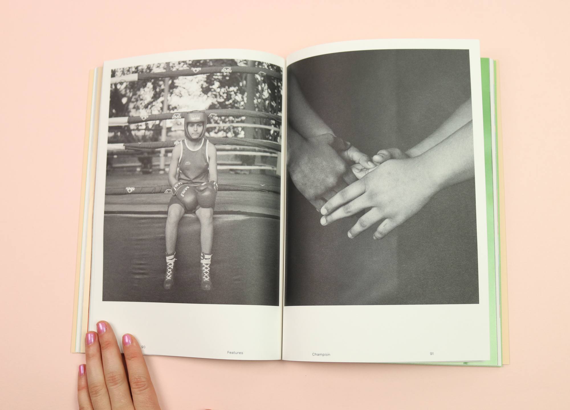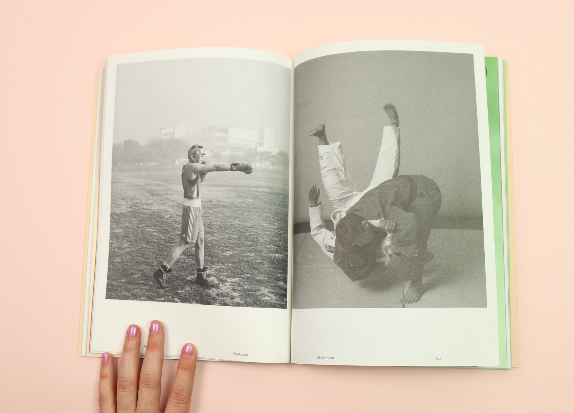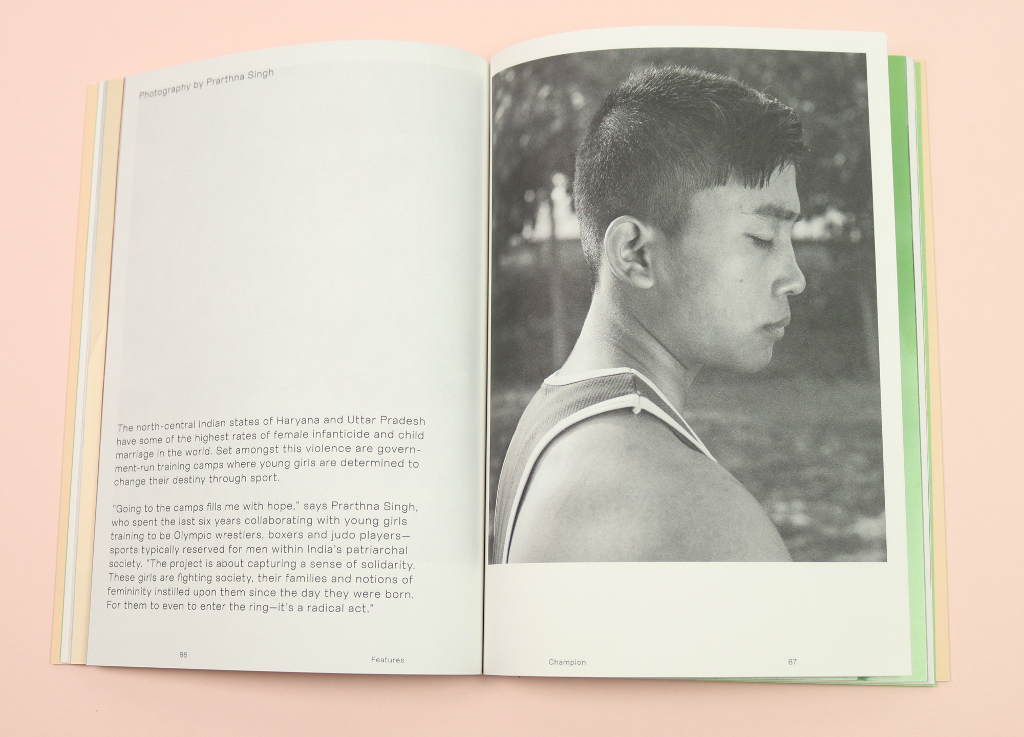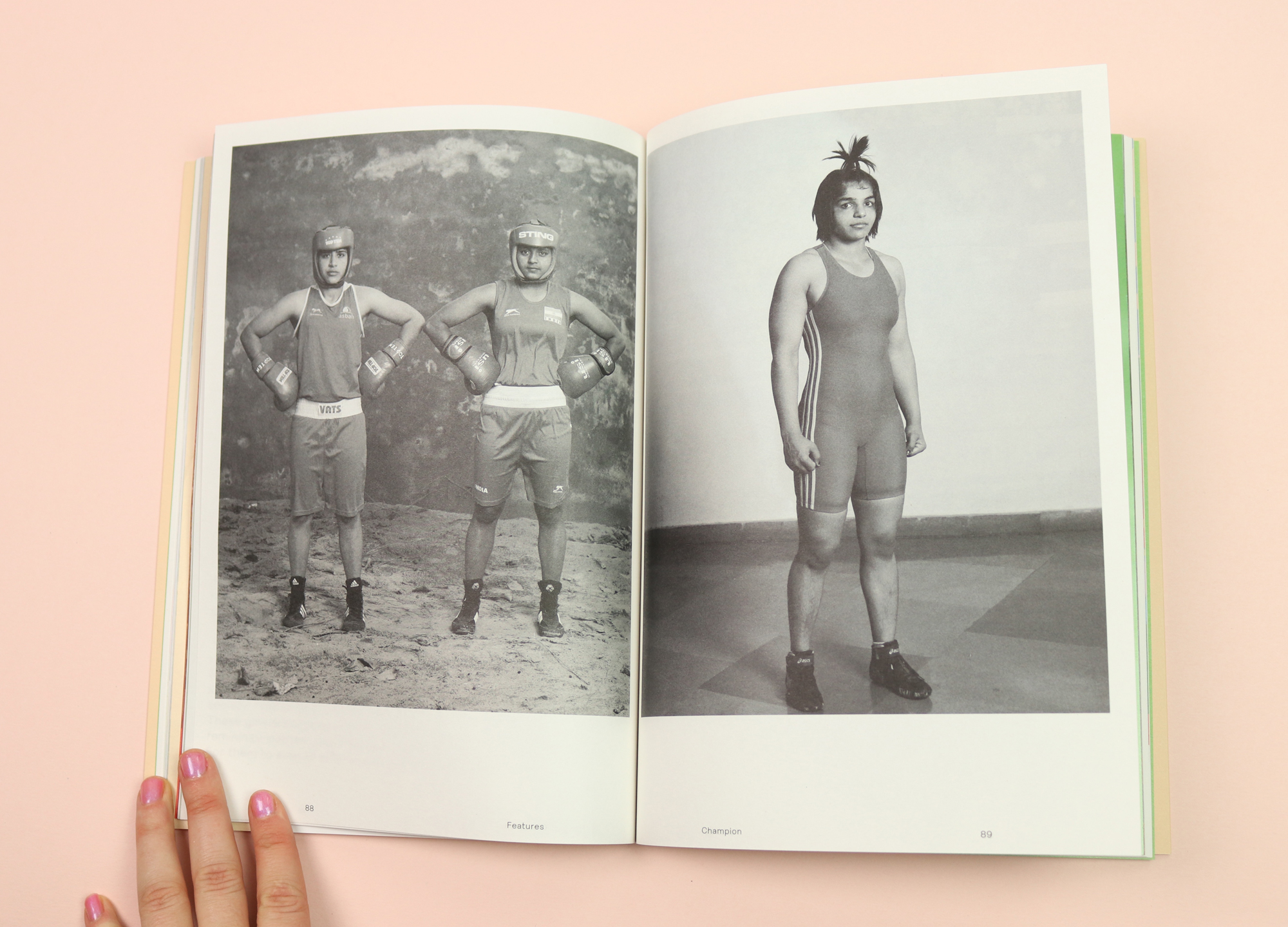 The design remains inventive, with signature Riposte cover-art; pale pink with no image at all, just a list of women you can expect to see inside: “Céline Semaan, Cassi Namoda, Nicole McLaughlin, Katherine Angel & Mya-Rose Craig”. Probably my favourite piece is entirely printed in black and white: images taken at government-run training camps in the north-central Indian states of Haryana and Uttar Pradesh, where young women train to become Olympic wrestlers, boxers and judo players.